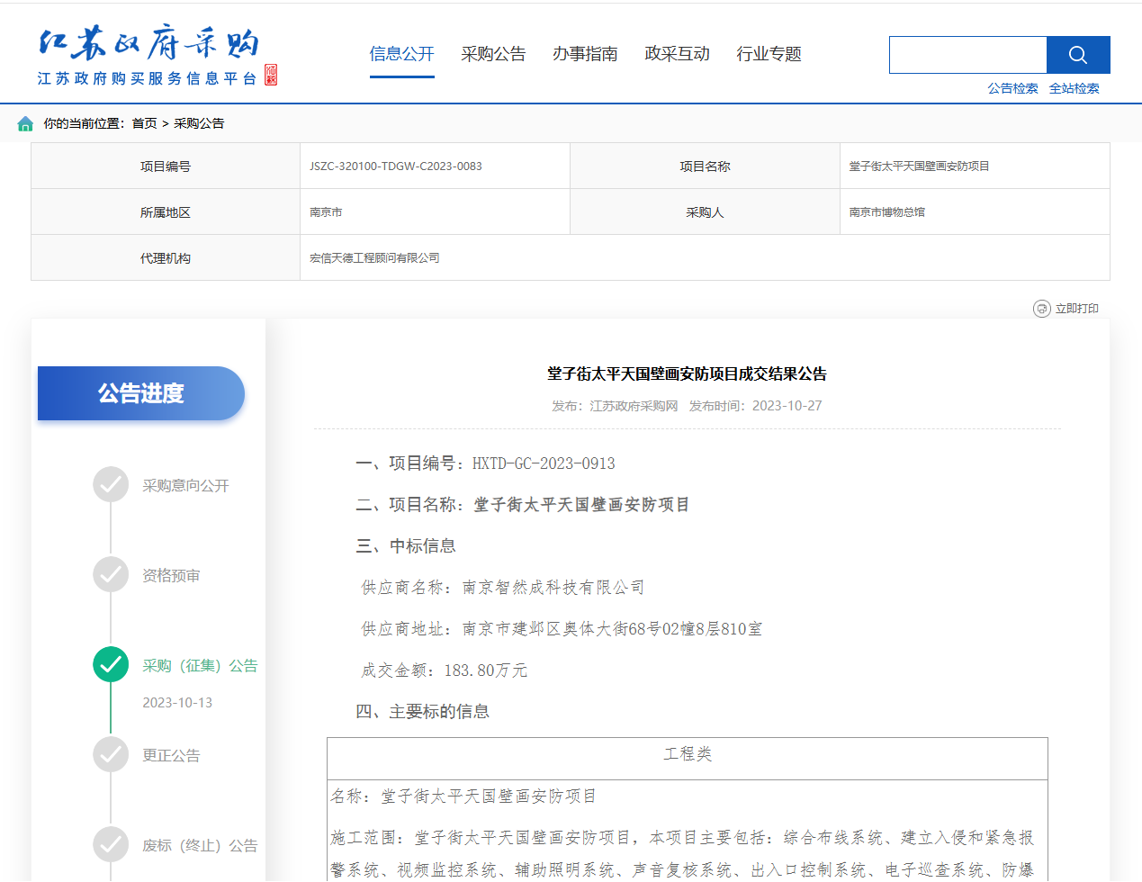 堂子街太平天国壁画安防项目成交结果公告中标,中标金额183.8万元