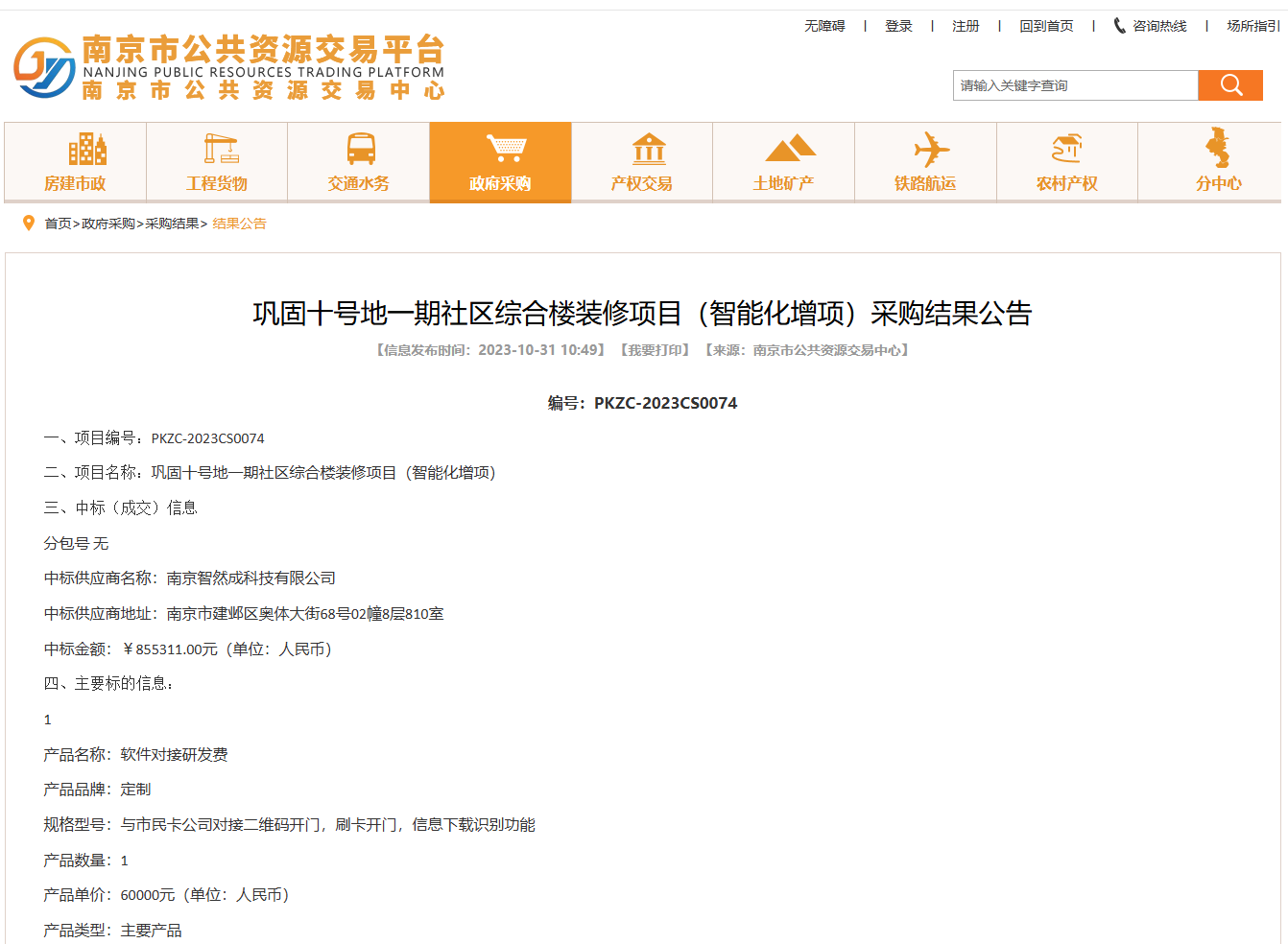 巩固十号地一期社区综合楼装修项目(智能化增项)采购结果公告,中标金额855311.00元