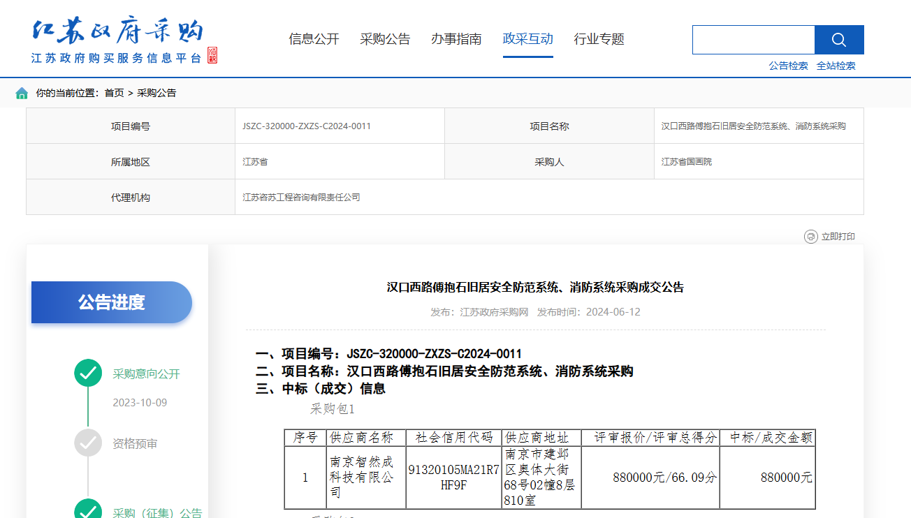 汉口西路傅抱石旧居消防系统采购成交公告
