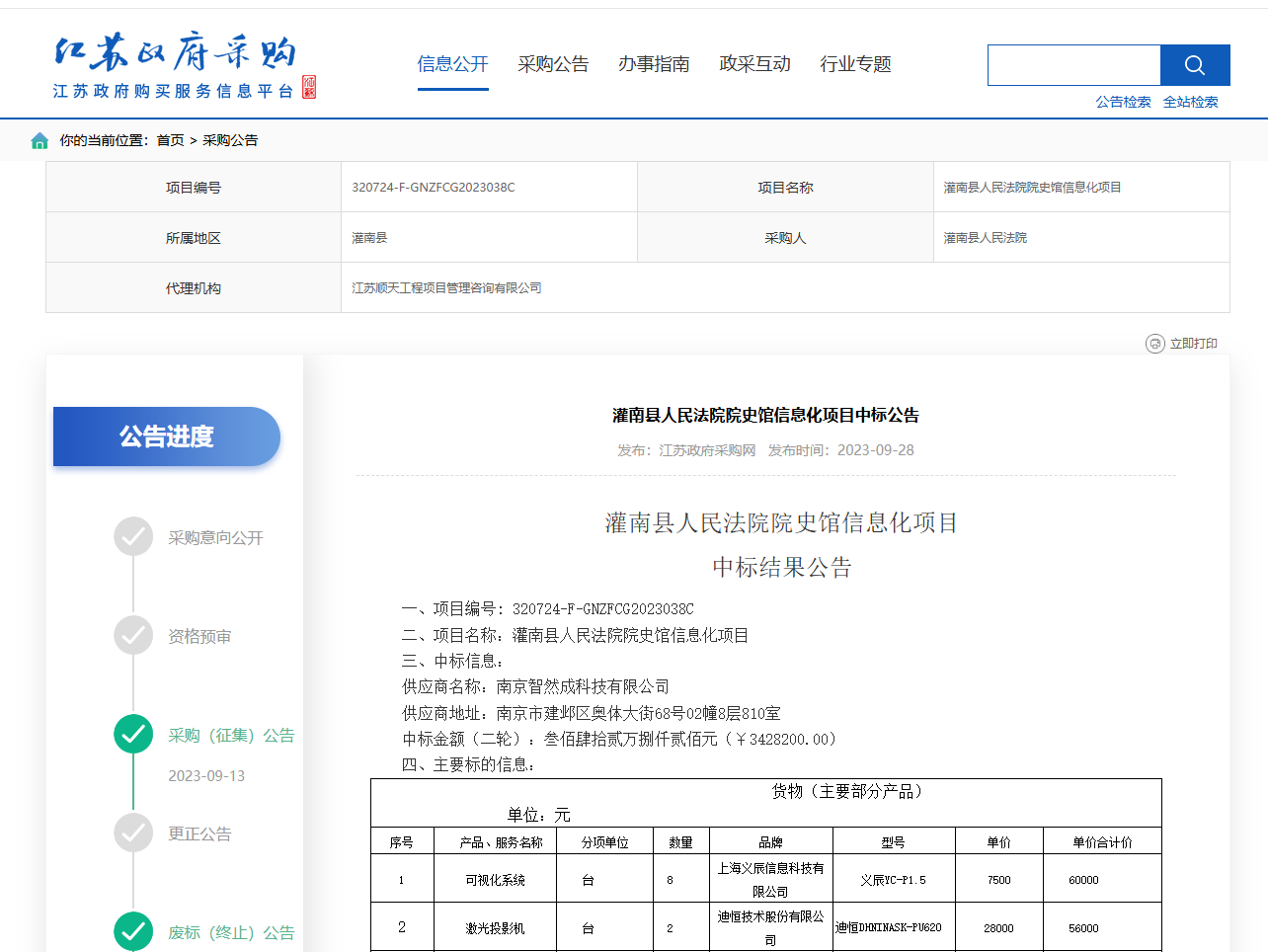 灌南县人民法院院史馆信息化项目中标公告,中标金额3428200元